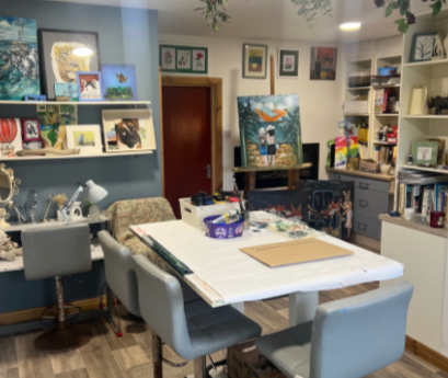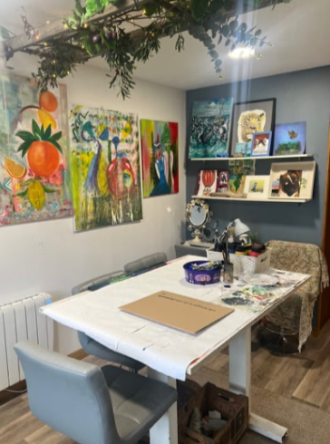 I find creative expression through vibrant, humor-infused paintings that blend expressionism and abstraction, employing a variety of unconventional tools to create depth and intensity. And it's all done in my Art Studio as seen in the featured image.